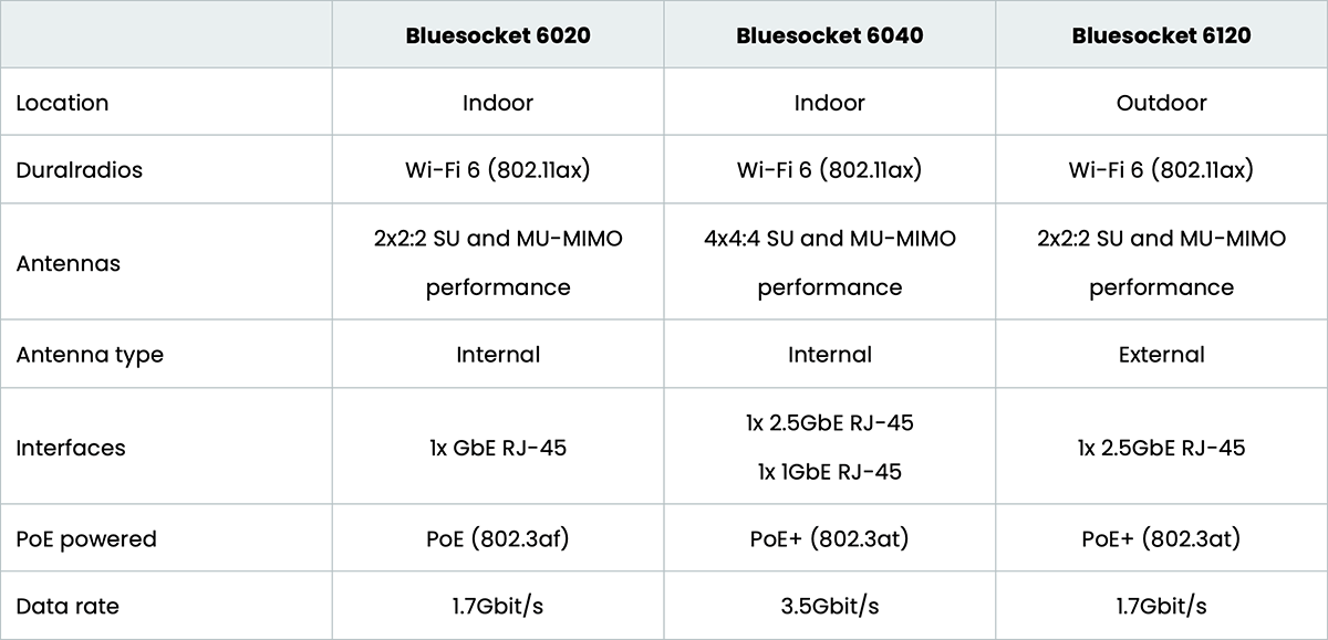 Our Bluesocket 6120 is an outdoor AP offering the latest Wi-Fi 6 technology. It offers 2x2:2 antennas and supports two transmit and two receive streams providing data rates up to 1.7Gbit/s (1.2Gbit/s for 5GHz and 574Mbit/s for 2.4GHz) per AP. In addition, the Bluesocket 6120 includes four SMA-type external antennas with up to 5dBi peak gain and is fully functional when powered by an 802.3at PoE+ solution.