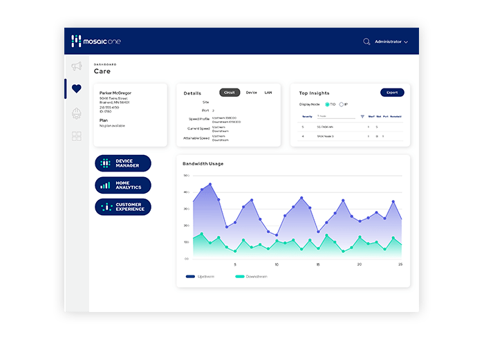 Mosaic One offers cloud-based software-as-a-service (SaaS) that aggregates information from management and orchestration platforms, broadband access, and consumer in-home devices to deliver three portals: Care, Operate, and Promote.