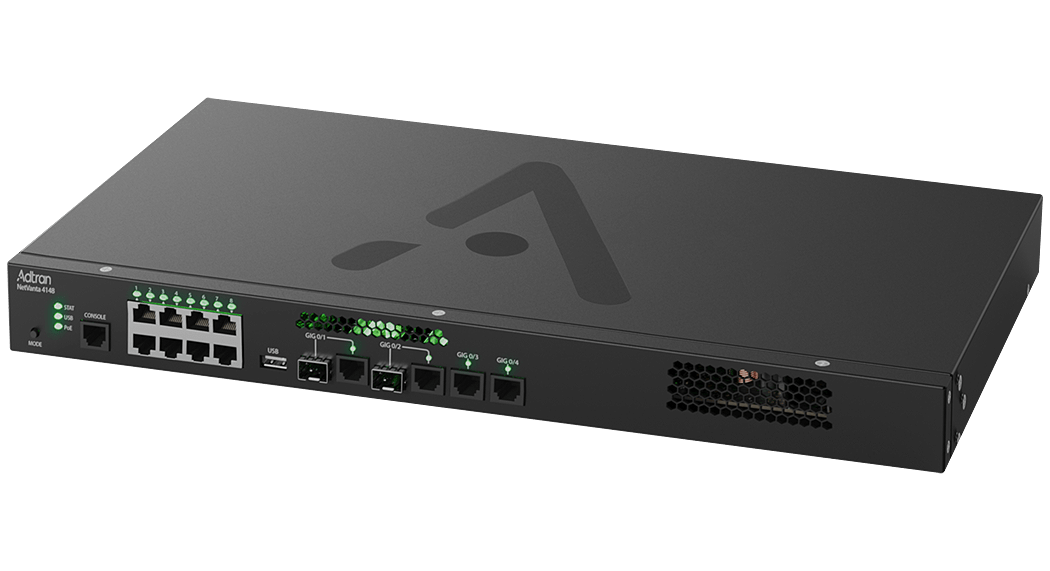 Our NetVanta 4148 provides four routed, autosensing Gigabit interfaces, two of which can be fiber-fed, and an 8-port power over Ethernet switch delivering 200 watts of PoE budget. The enhanced feature pack upgrade adds the ability to support 500 VPN tunnels. It enables voice quality monitoring (VQM), a graphically intuitive interface displaying captured data for mean opinion score (MOS), jitter, delay and packet loss statistics necessary to troubleshoot VoIP calls. Part number 47004148F21.