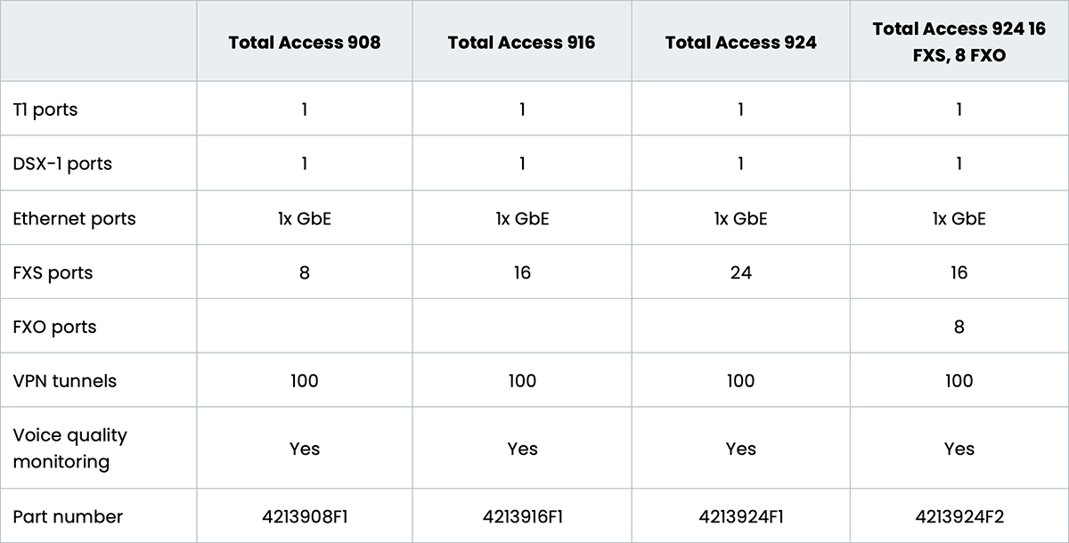 Our Total Access 900 Series is designed for Ethernet or multi-T1 applications. It includes four T1 interfaces, one Gigabit, and two Fast Ethernet interfaces for LAN or WAN facing, and several platforms of varying user interfaces (up to 24 FXS ports) for analog voice delivery. The devices also offer the ability to add SBC functionality for up to 100 simultaneous calls.