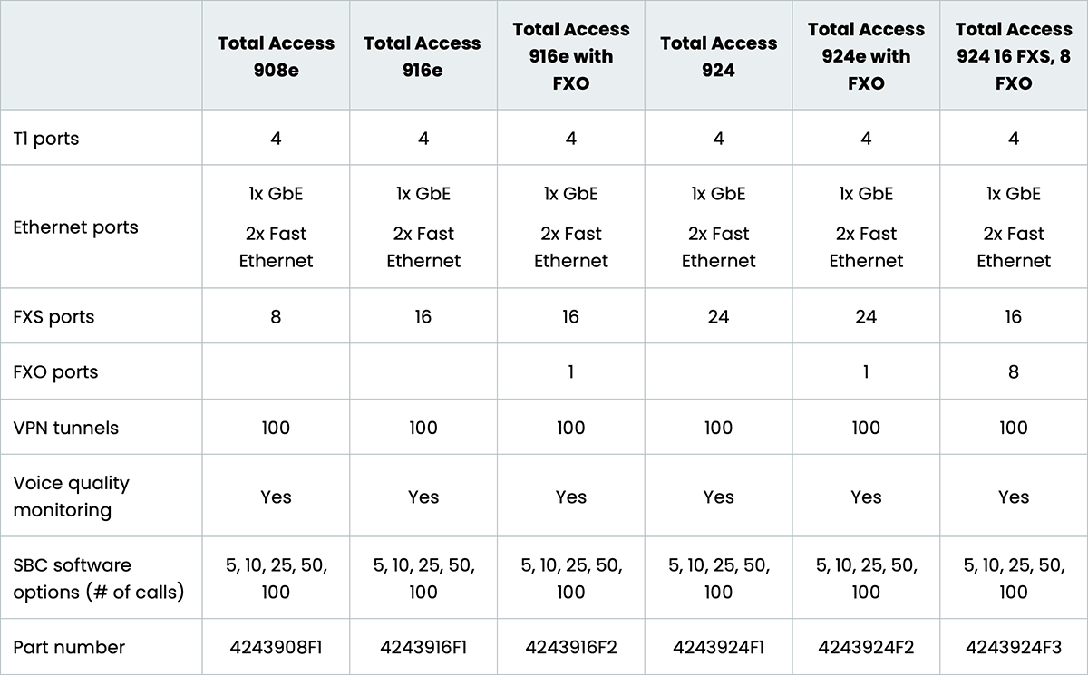 Our Total Access 924e offers 24 FXS ports via an Amphenol connection for analog voice delivery, one FXO port, four T1/FT1 ports, and three Ethernet interfaces (one Gigabit and two Fast) for access for WAN or LAN access. Part number 4243924F2.